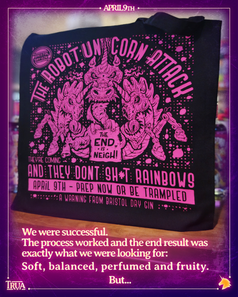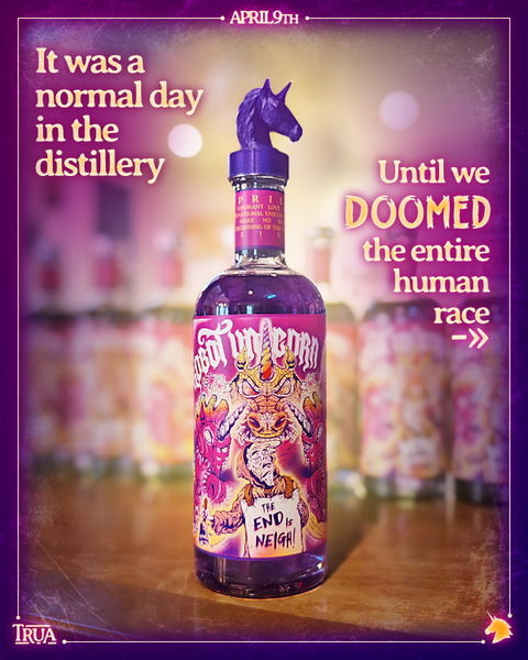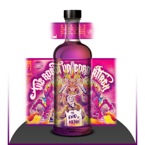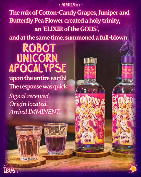 We’ll admit it, we unknowingly doomed the planet by merging three holy botanicals: cotton candy grapes, butterfly pea flower, and juniper. This alerted maniacal Robot Unicorns from a distant galaxy, far, far away. They’re heading to Earth at this very moment, and they don’t s**t rainbows.