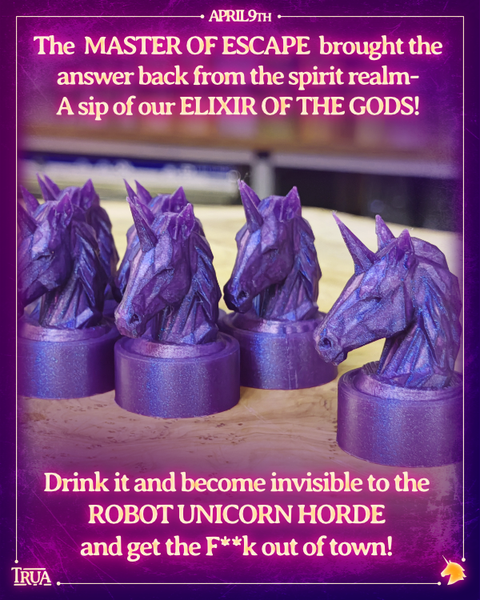 A sip of the very elixir that summoned the Robot Unicorns gives the drinker invisibility from the mechanical horde and a chance to escape their evil clutches.
